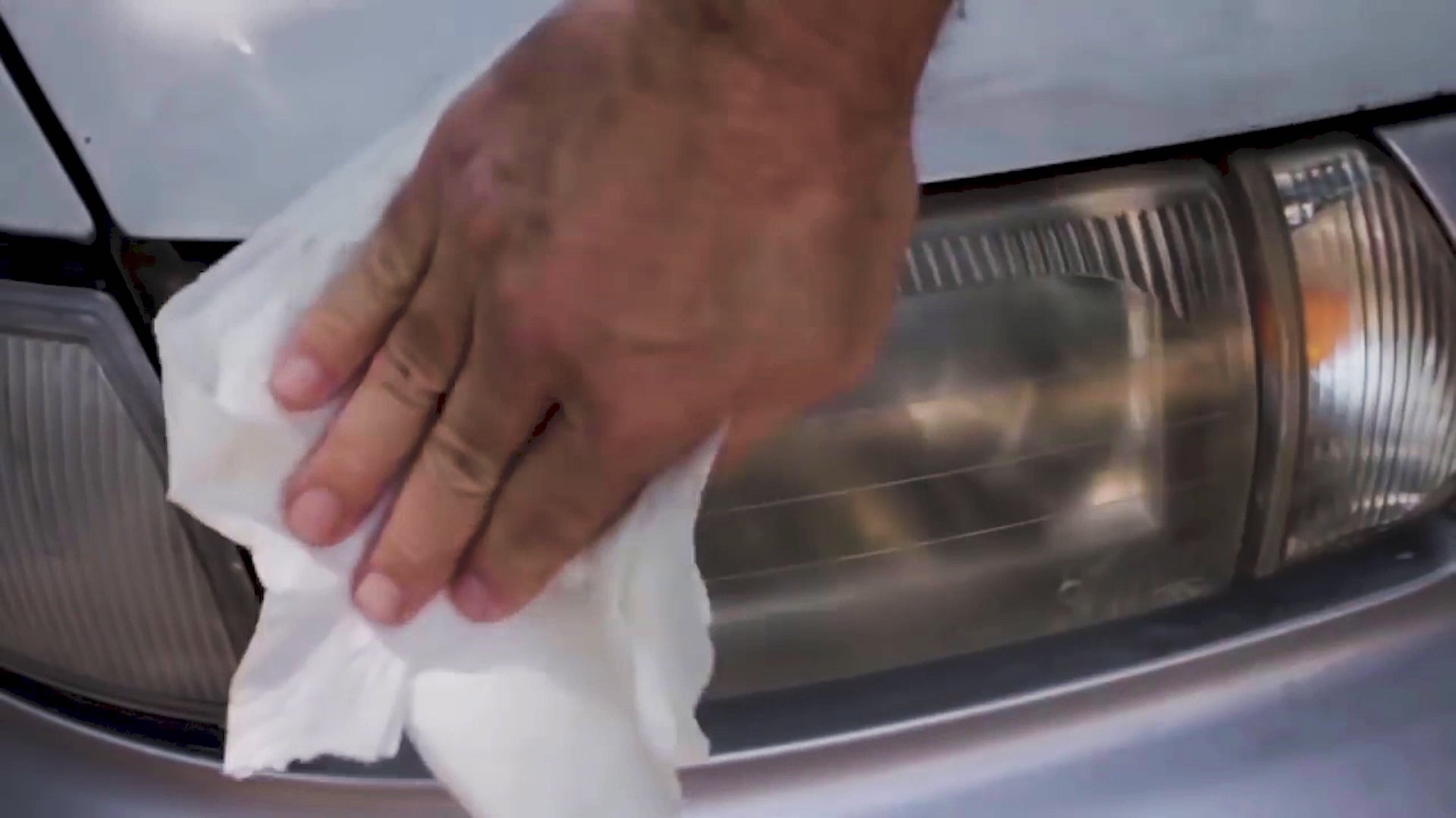 С червената кърпичка #2 третирате равномерно повърхността на двата фара. С нея ще нанесете издръжлив защитен слой, който ще предпазва фаровете, след като засъхне.
